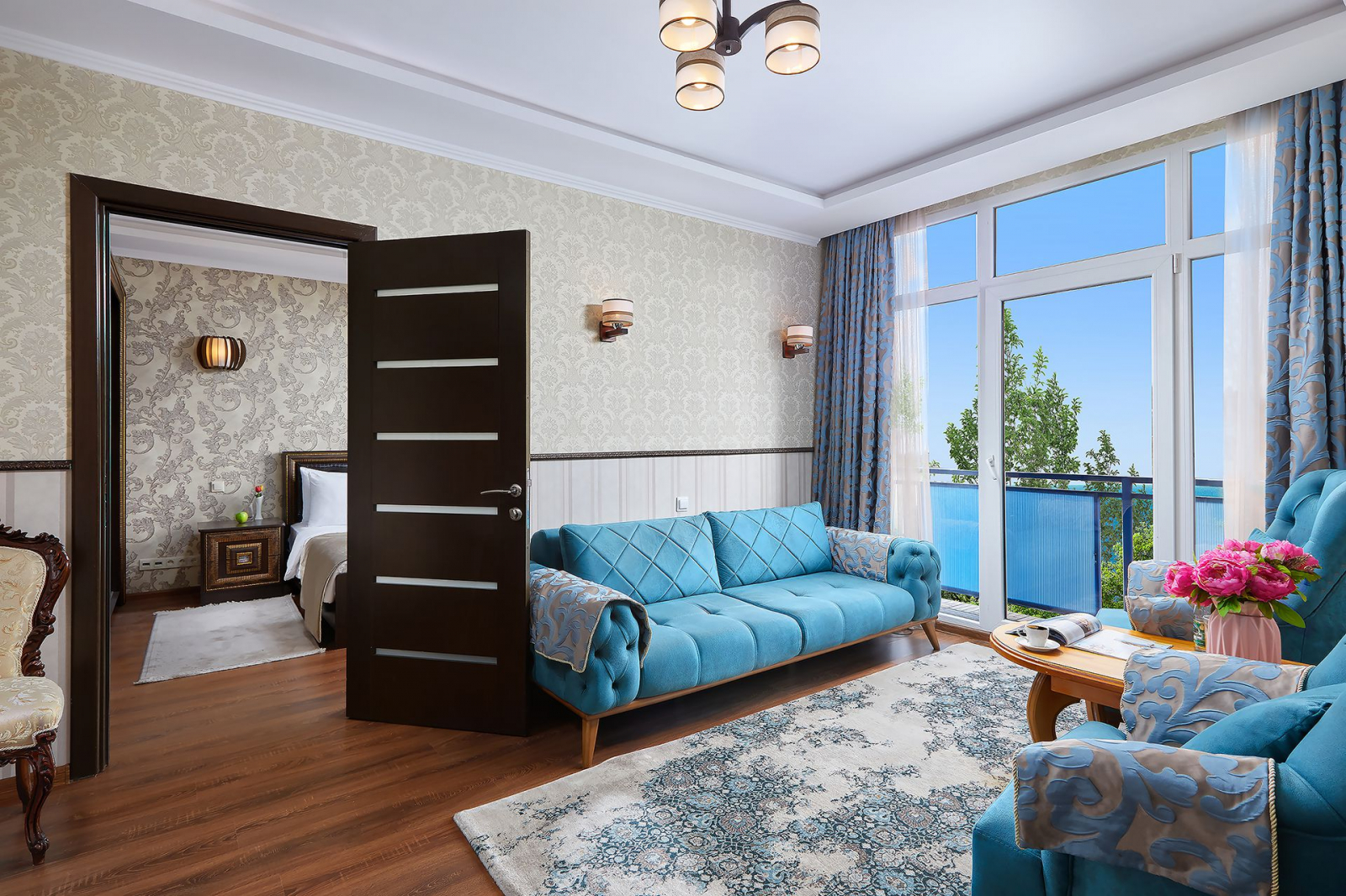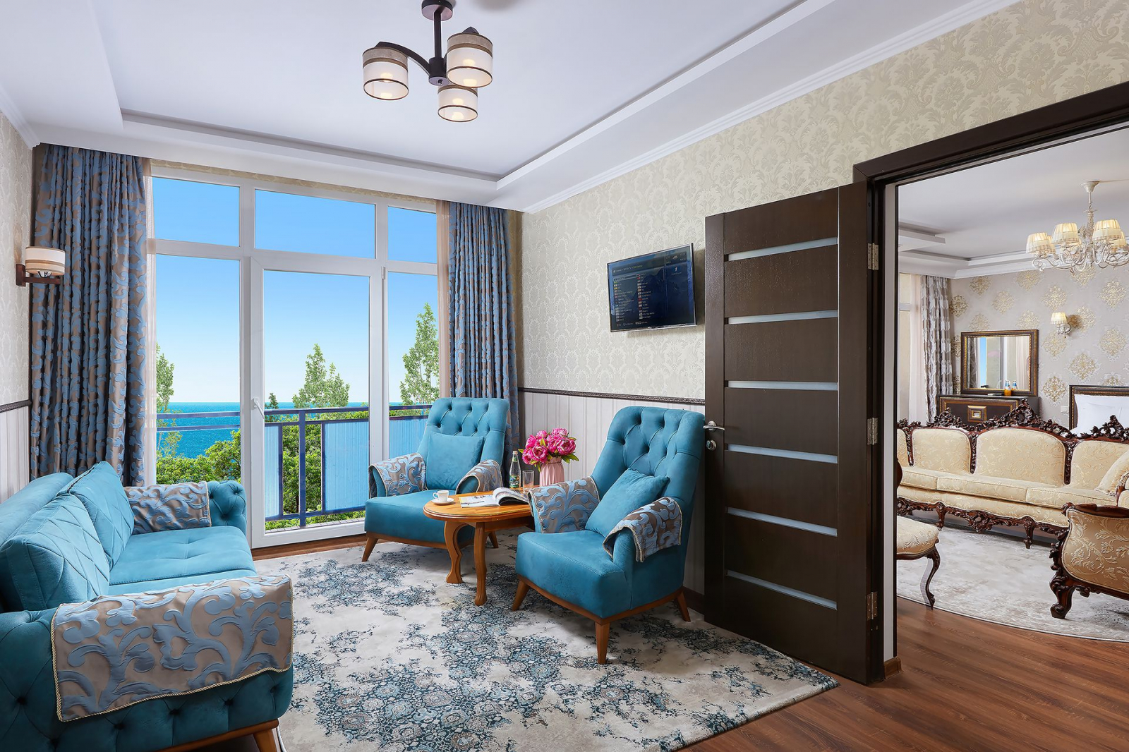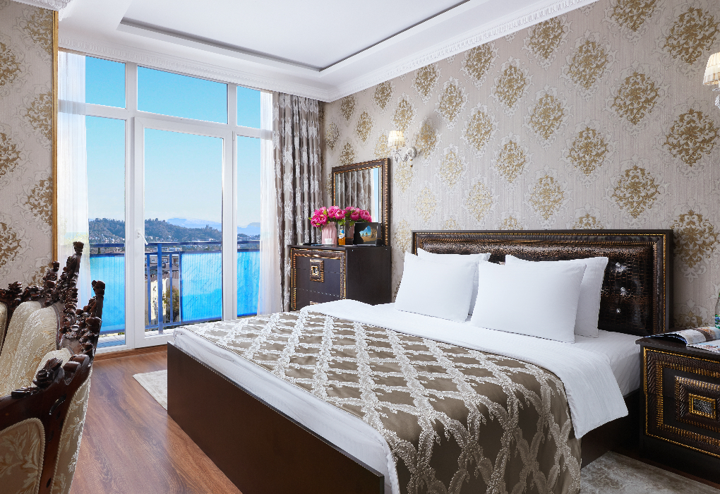 3 комнаты. 4 осн. места. спальня с 2-спальной кроватью, спальня-гостиная с 2-спальной кроватью, кабинет. В номере: телевизор; холодильник; балкон; кондиционер; душ; туалет; мягкая мебель; мини-кухня.
