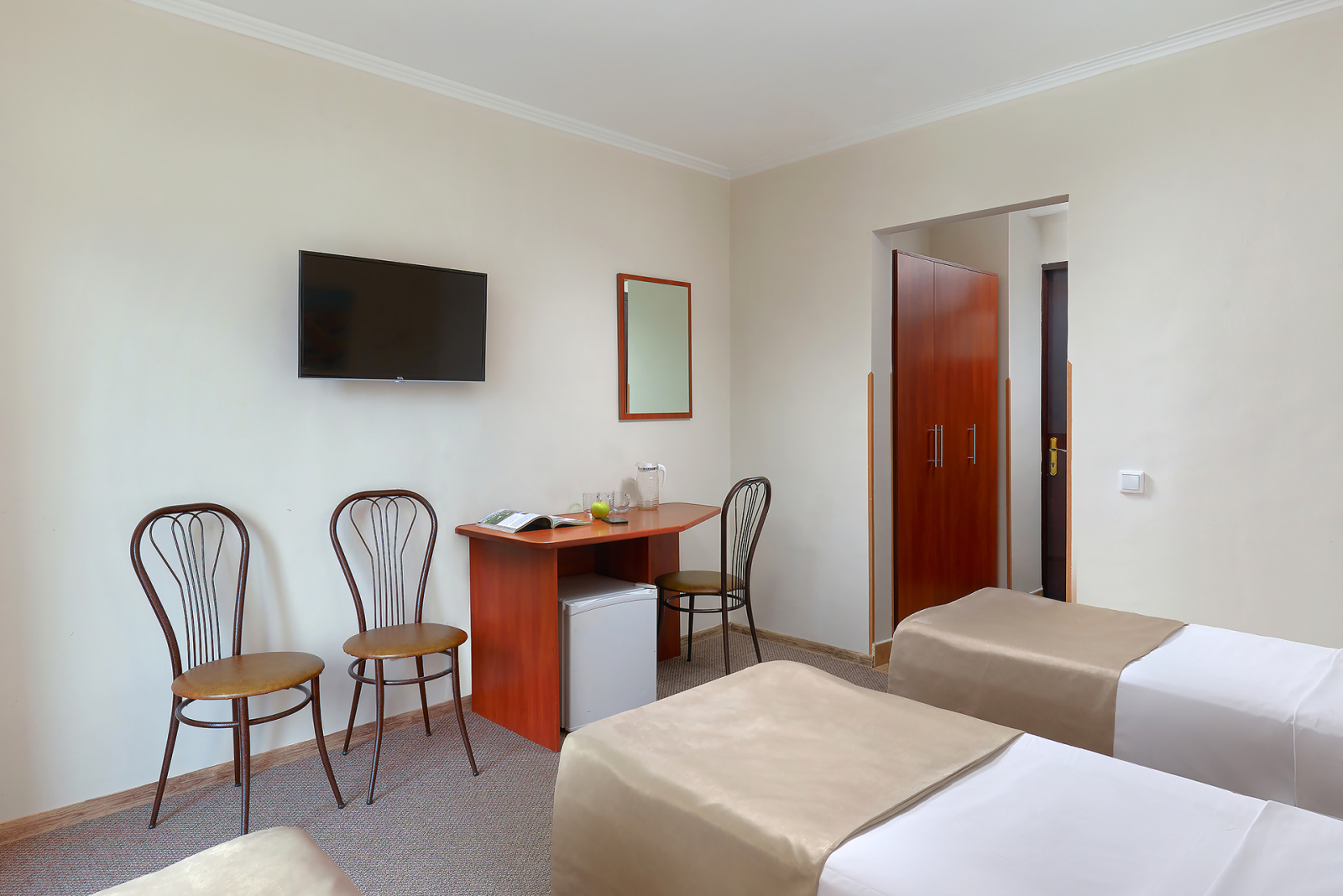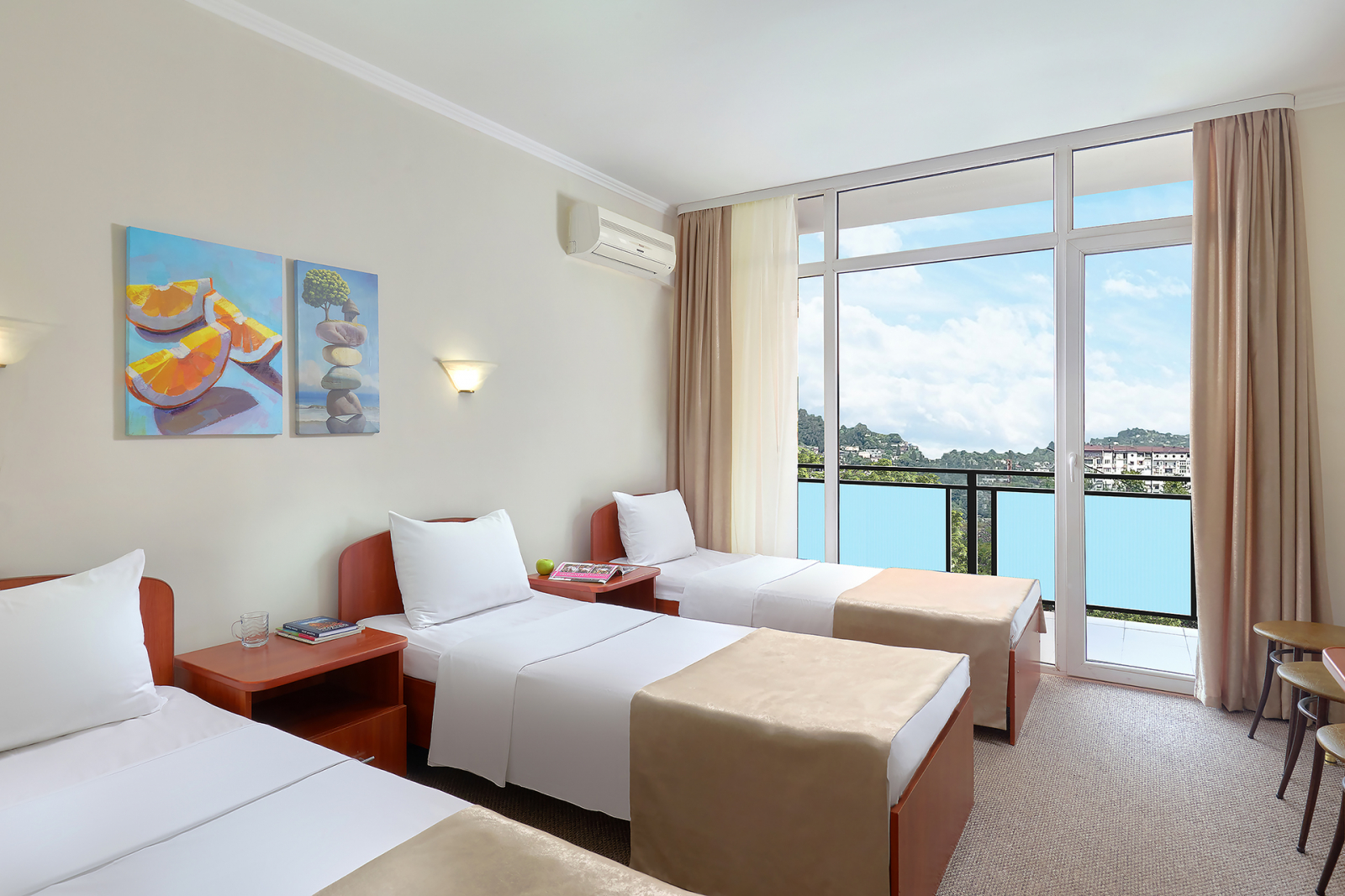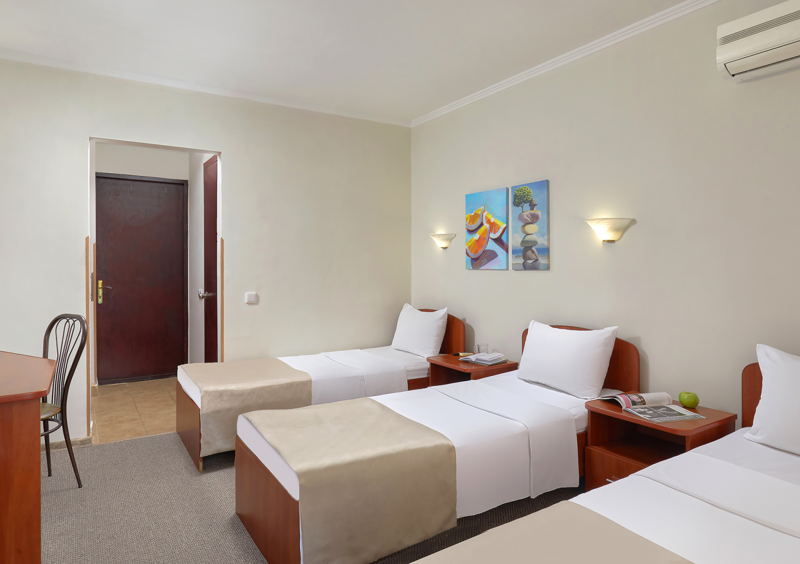 3 осн. места. Балкон. Мебель: вешалка, зеркало, кровати односпальные (3), прикроватные тумбочки, стол, стулья, шкаф. Оборудование: сплит-система, телевизор, холодильник. Санузел: с душем, туалетные принадлежности, фен (по запросу). Сервис: Wi-Fi бесплатно, смена полотенец, смена постельного белья, уборка номера.